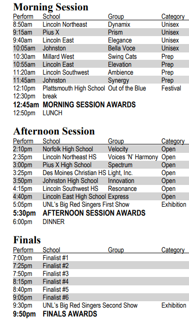 The Midwest Cup Show Choir Invitational is a full day of spectacular vocals and intense choreography, held in one of the premier venues in all of show choir competition anywhere in the country. Approximately 800 student musicians will gather on the Lied Center stage to perform for 2,300 seats filled with enthusiastic fans, friends, and listeners. The Midwest Cup provides an opportunity for some of the finest show choirs in the region to showcase their performances and compete against one another for the grand championship at the end of the evening. In the final analysis, while only one school will be named Grand Champion, everyone in attendance "wins," by being part of this full day of the highest level of this musical art.