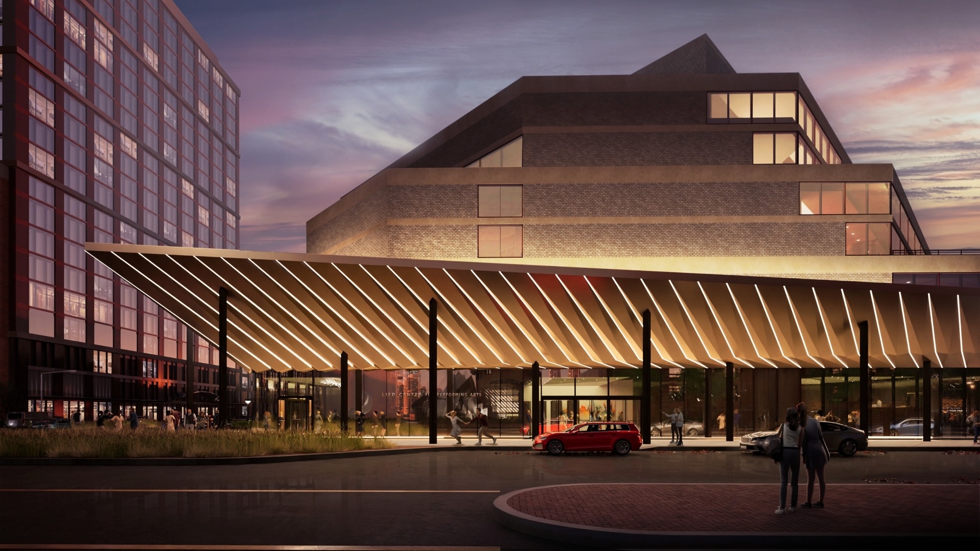 - Addition: An approximately 11,150-square-foot addition will be constructed. On the building’s north side,the addition will include a new studio theater for performances, workshops, arts education classes and rehearsals, allowing independent activities to take place even when a national touring performance is taking place in the Lied Center’s main hall. The addition also includes a dressing room, a shared foyer for the new studio theater, enhanced Lied Commons and a new donor lounge. A new entry lobby with ticket office will be constructed on the south side of the building, along with the new entrance.